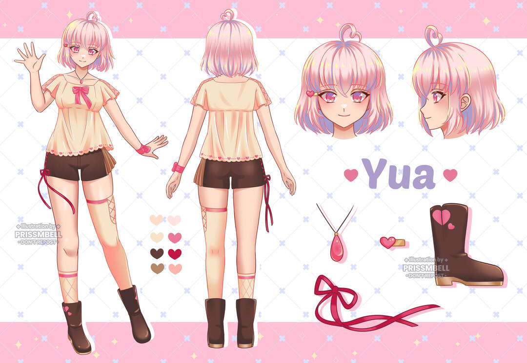 You get: Front and behind view, 2 faces/expressions and drawing of a few detailed parts of clothes